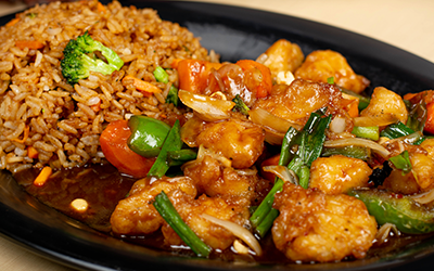 Riquísimo platillo de camarón acompañado de pimiento verde y rojo, piña, cebolla cambray y chile de árbol, mezclados con una deliciosa salsa dulce servido sobre una cama de fideos crujientes. **