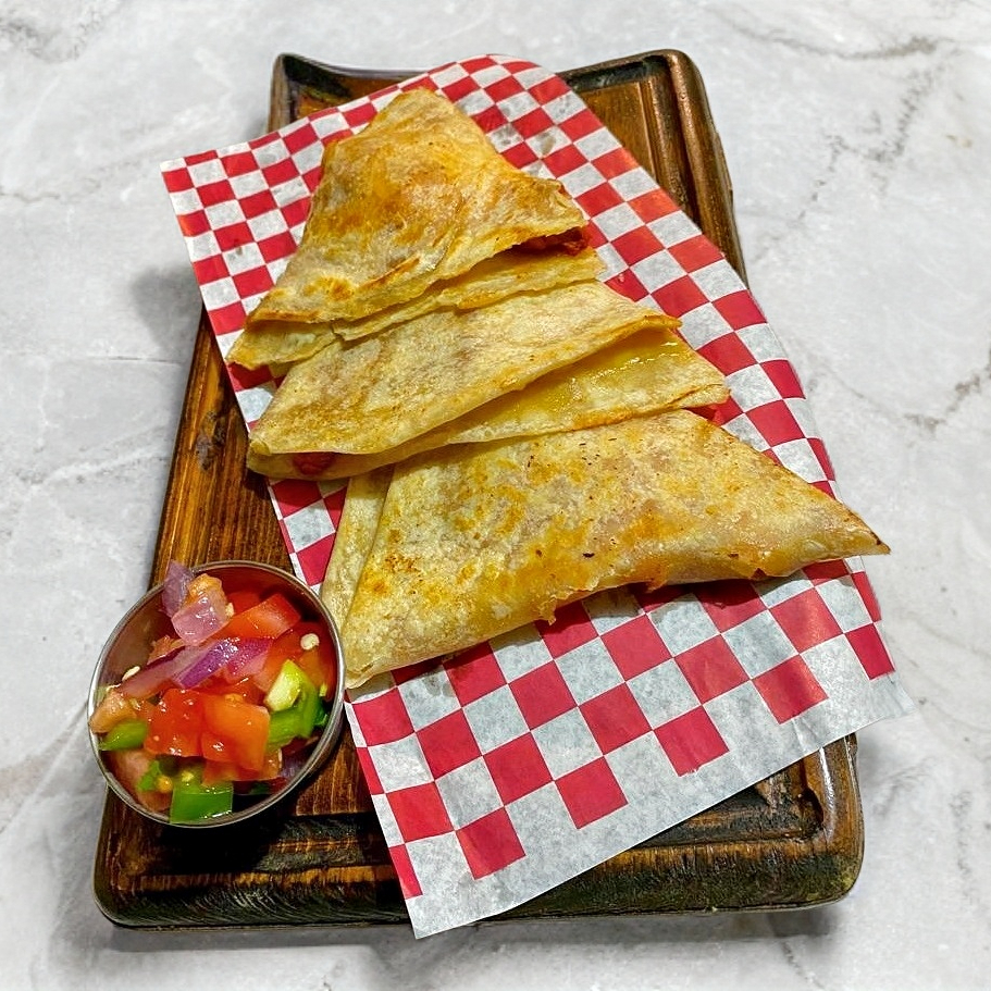 Quesadilla rellena de queso gratinado y una milanesa empanizada en especias