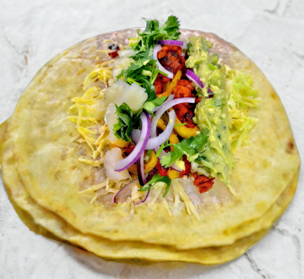 Carne al pastor, pimiento morrón, cebolla morada, cilantro, piña, guacamole.