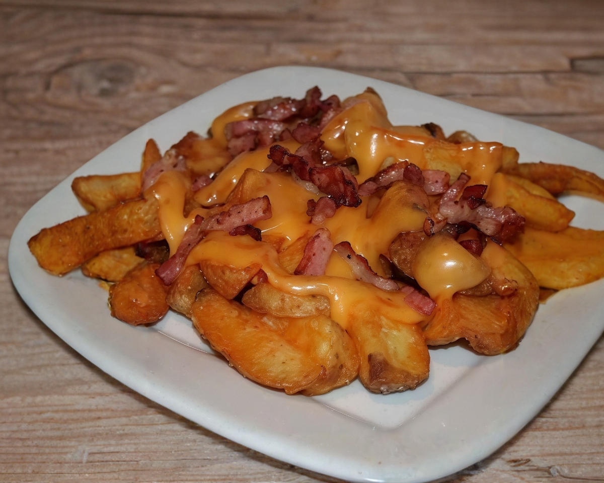 Papas gajo sazonadas, queso cheddar, tocino