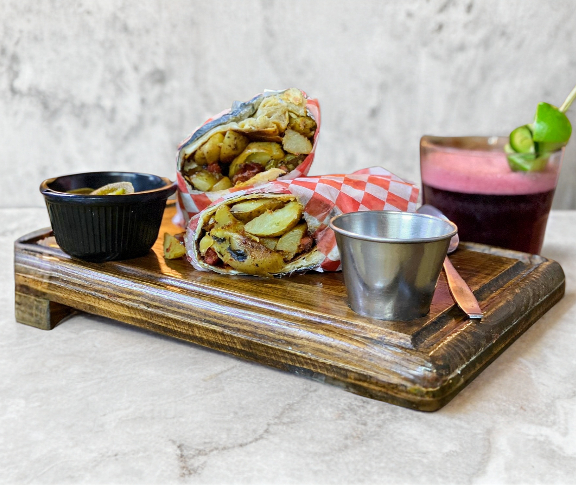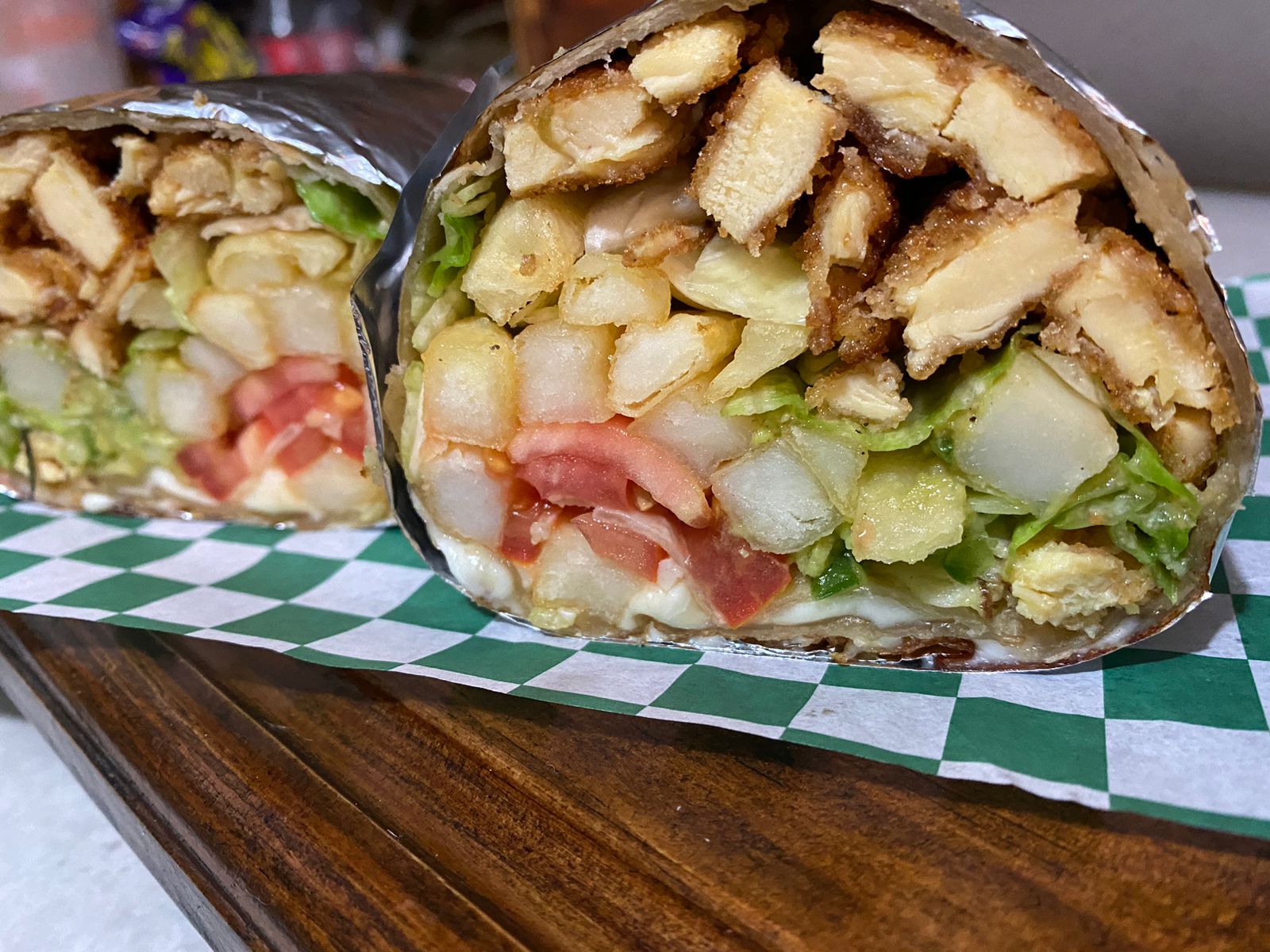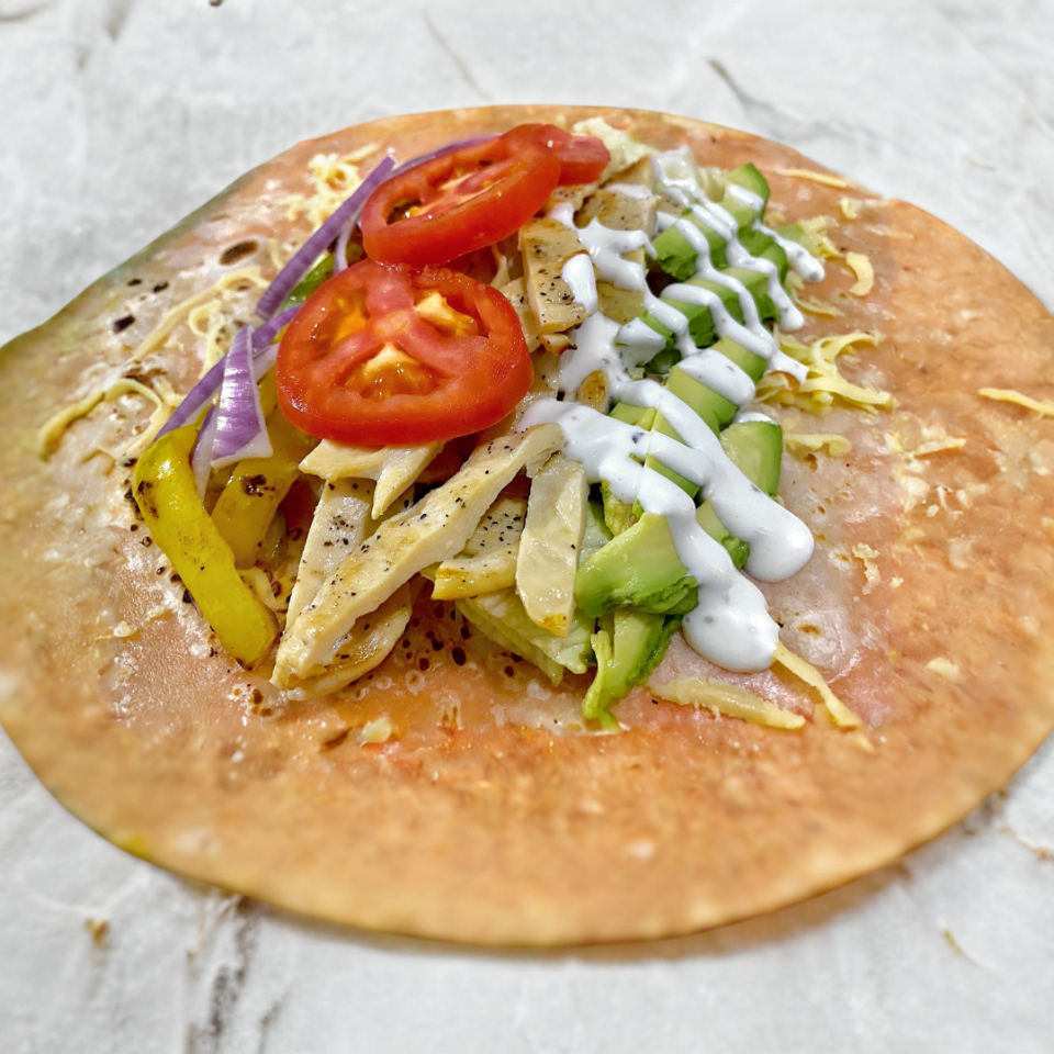 Lechuga, champiñones, calabacitas, zanahoria, cebolla morada, pimiento morrón, queso de hebra, aderezo ranch. Hecho con tortilla de harina de 32 cm.
