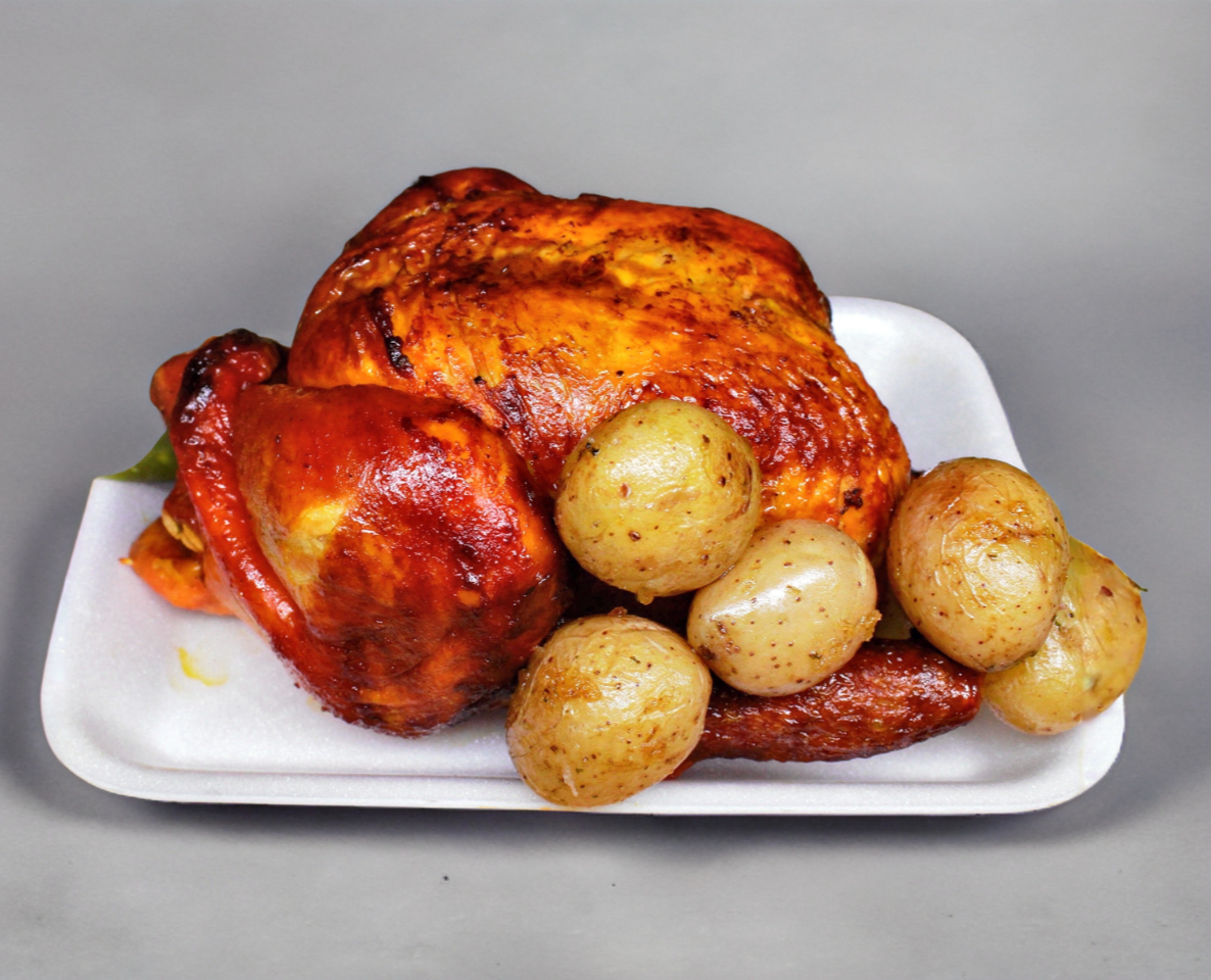 Un pollo rostizado dividido en 10 piezas, acompañado de una porción de papa cambray, arroz, 9 tortillas, salsa verde y cebolla.