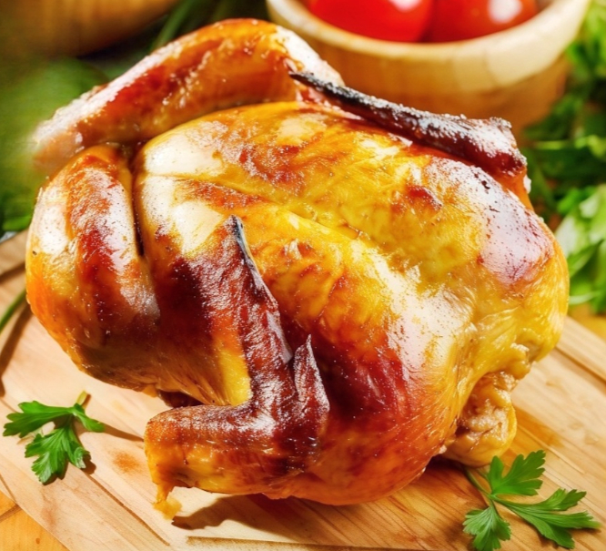 Pollo tipo empanizado crujiente, medio pollo acompañado de papas a la francesa, capsut y aderezo.