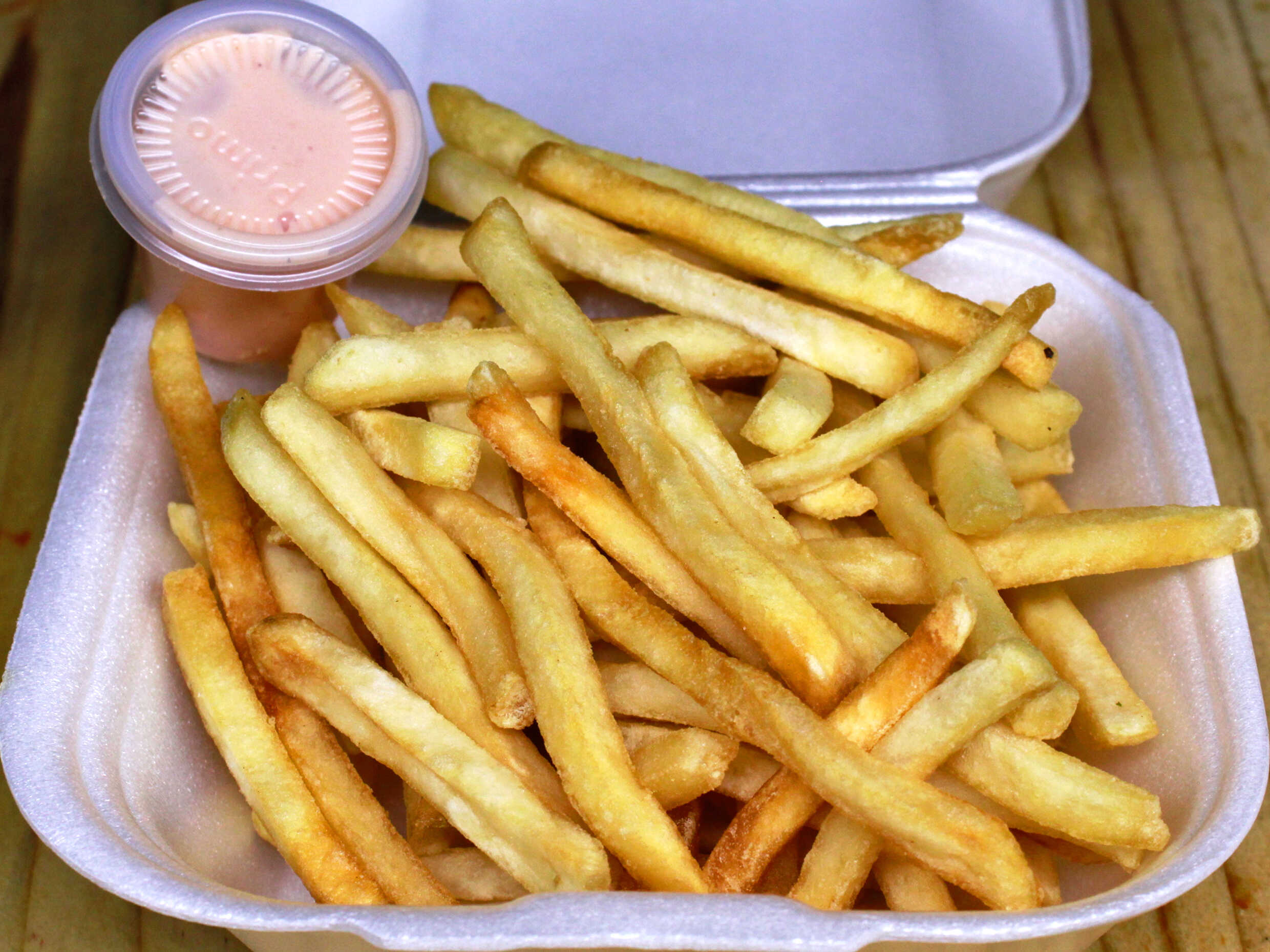 Deliciosas tiras de pollo bañadas en la salsa de tu preferencia, acompañadas de Papa a la francesa 100gr, aderezo de la casa y capsut