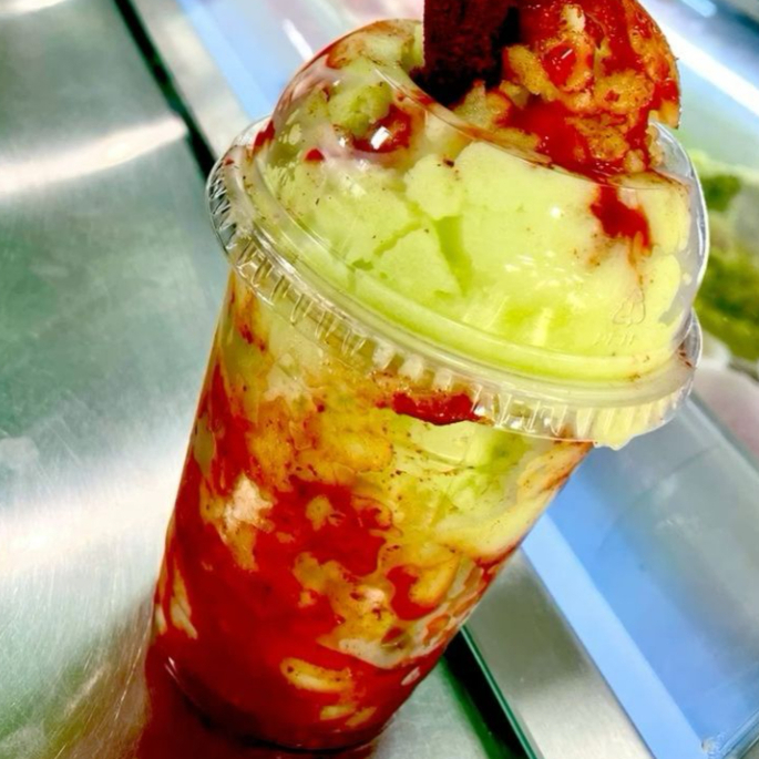 Vaso de 14 Oz de Frappe Limon bebida deliciosa y refrescante a base de agua acompañado de chamoy y chile