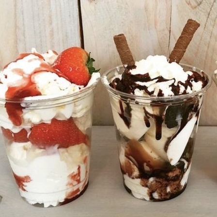 Vaso de 12 oz de fresas naturales y duraznos en almíbar previamente seleccionadas acompañadas de crema de leche y ingredientes a elegir