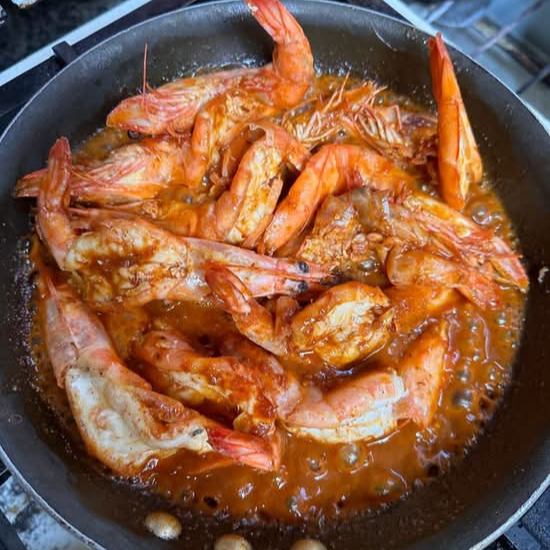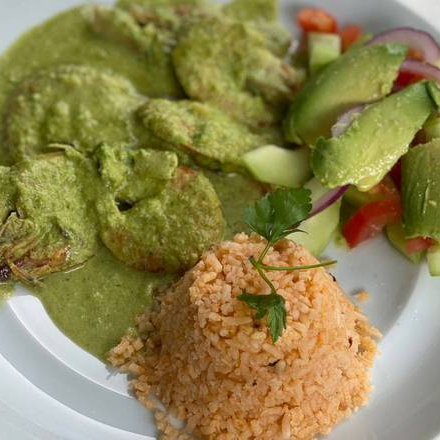 Camarones a la chilpaya 250 g, acompañado de arroz y ensalada. Totopos, aderezo y tortillas.