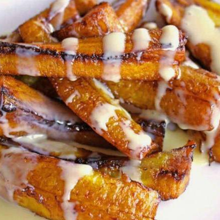 Postre plátanos fritos 200 g acompañados crema y lechera.