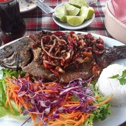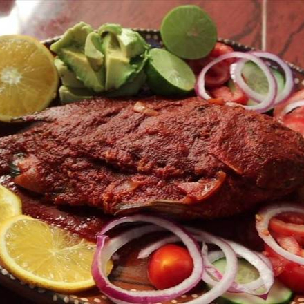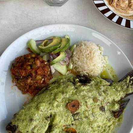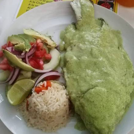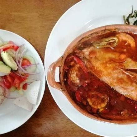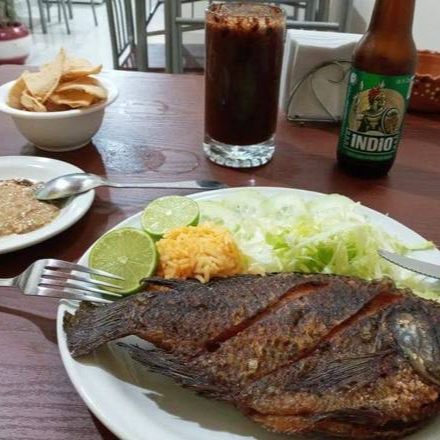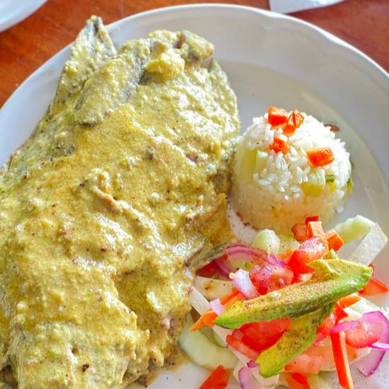 150 g Filete de pescado (tilapia), guisado con chile chilpaya, mayonesa y crema, acompañado con arroz, ensalada, tortillas, aderezo y totopos.