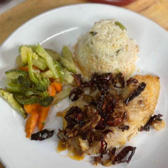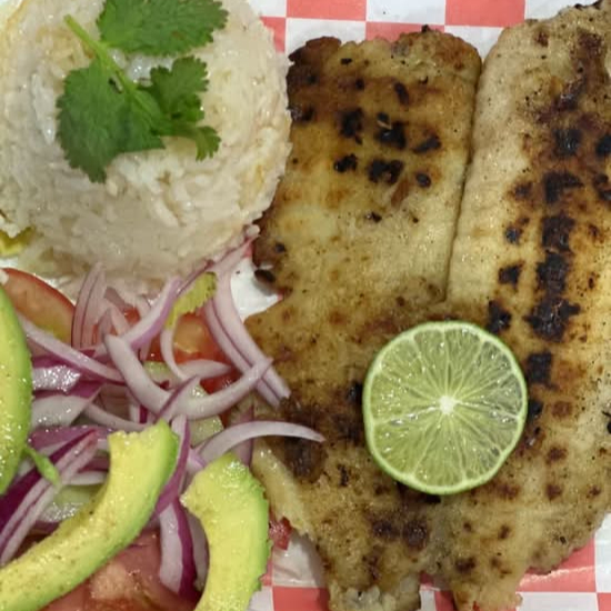 150 g Filete tilapia a la plancha preparado a las finas hierbas y un toque de mantequilla, acompañado de arroz, ensalada de fruta o verduras, tortillas, totopos y aderezo.