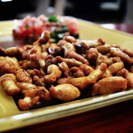 250 g De camarón con tocino y queso de hebra, empanizados, acompañados de arroz, ensalada, aderezo y totopos.