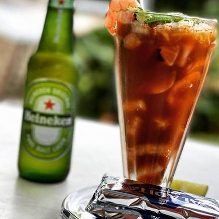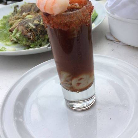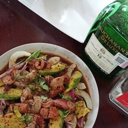 Camarón y pulpo cocido con pepino, cebolla morada, aguacate, salsa inglesa, salsa de soya, chiltepín, habanero.