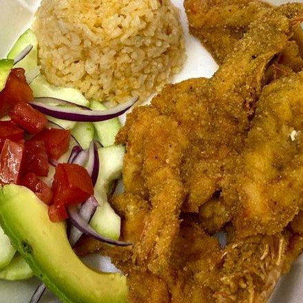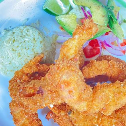 250 g Camarones empanizado, acompañado de arroz y ensalada. Totopos, aderezo y tortillas.