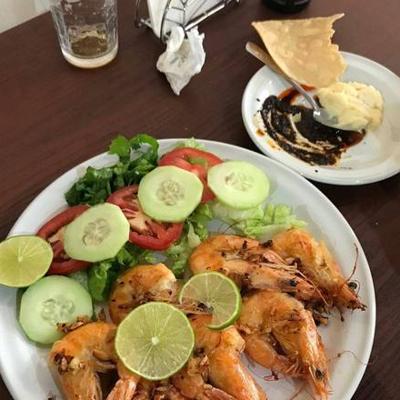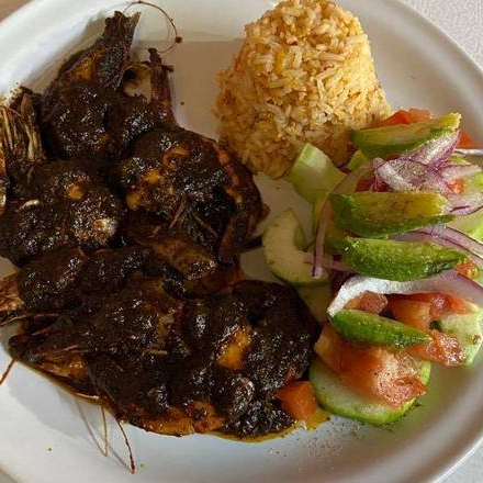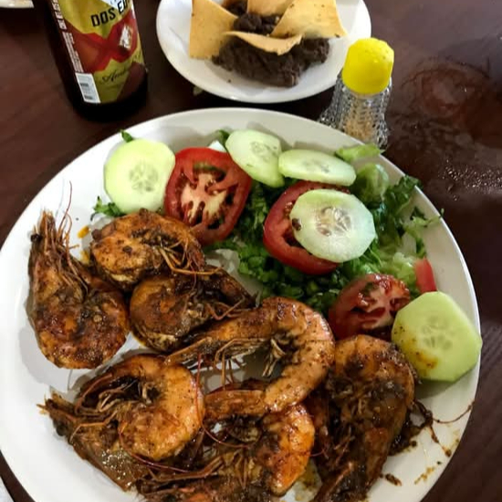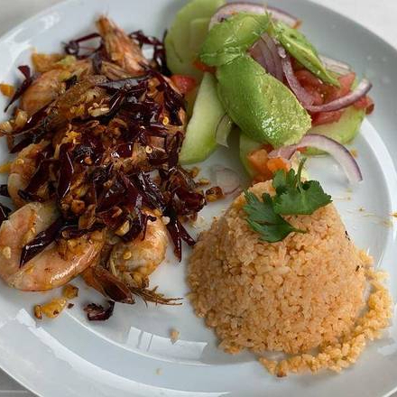 Camarones grandes 250 g, acompañado de arroz y ensalada. Totopos, tortilla limón y aderezo.