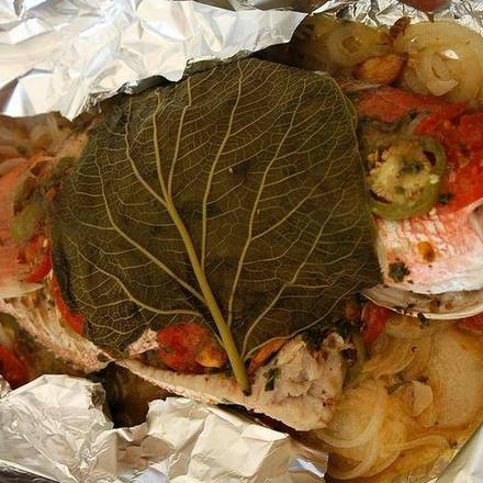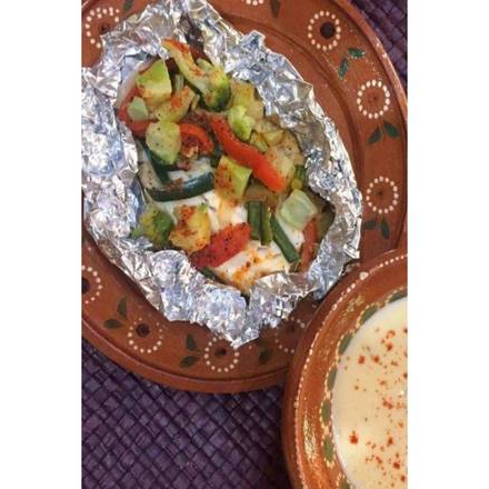 150 g Filete de tilapia cocido al vapor (empapelado), con acuyo y verduras. Jitomate, chile morrón, cebolla, chile xalapeño.