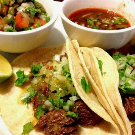 3 Tacos de maíz con carne deshebrada, cebolla y cilantro.