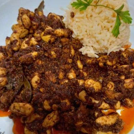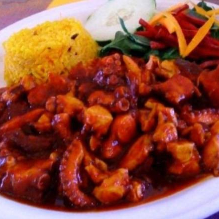 Tentáculos de pulpo 220 g, muy picante acompañados de arroz y ensalada. Totopos, tortillas y aderezo.