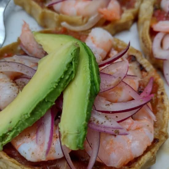3 pzas De tostadas crujientes con camarón, aguacate y cebolla morada.