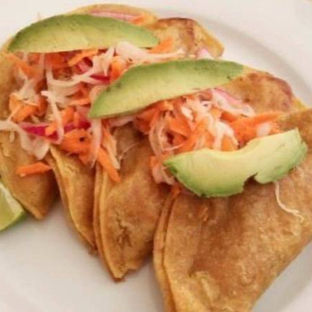 3 pzas De tacos dorados crujientes rellenos de minilla, con ensalada de col y zanahoria, rebanadas de aguacate y limón.