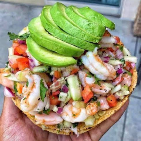 1 Tostada acompañada de camarón, pepino, jícama, jitomate, cebolla morada salsa botanera y aguacate, condimentos de la casa.