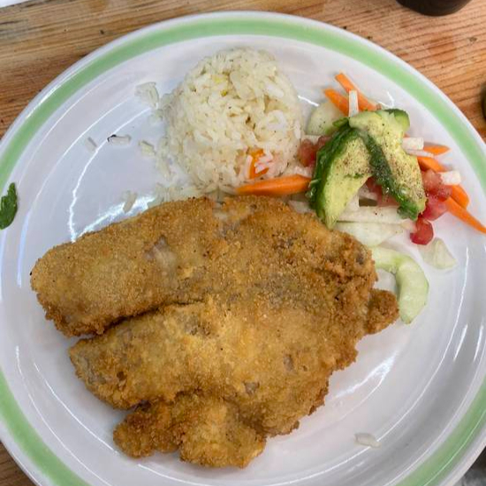 Filete de tilapia empanizado, 150 g acompañado con arroz y ensalada jitomate, lechuga, zanahoria y cebolla morada.