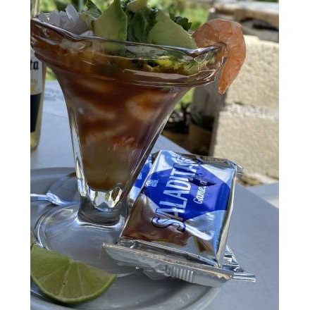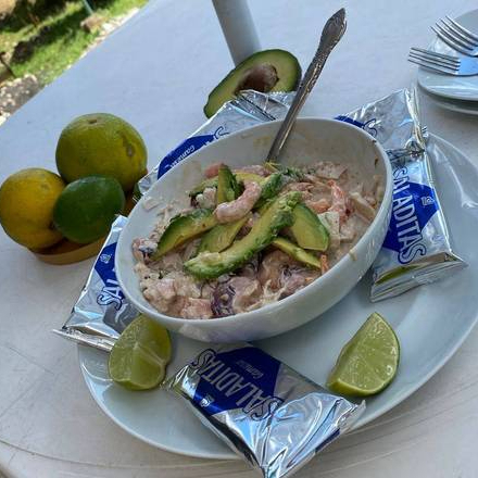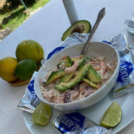 250 g De ensalada de camarón, pulpo, jaiba, surimi, combinación rica crema y mayonesa, acompañado de jitomate, cebolla, chele y aguacate.