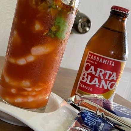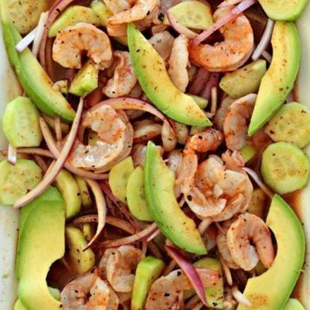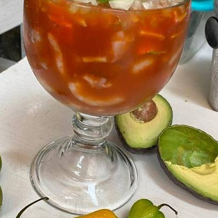 Camarón cocido con limón, pepino, cebolla morada, aguacate, chile piquín, salsa de soya, salsa inglesa (muy picante).