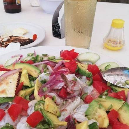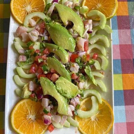 Pescado cocido con limón, jitomate, cebolla morada, pepino, aguacate, chile habanero.