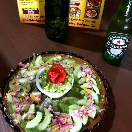 Camarón cocido con limón, pepino, cebolla morada, guacamole picante al gusto (habanero, chiltepín o chile serrano).