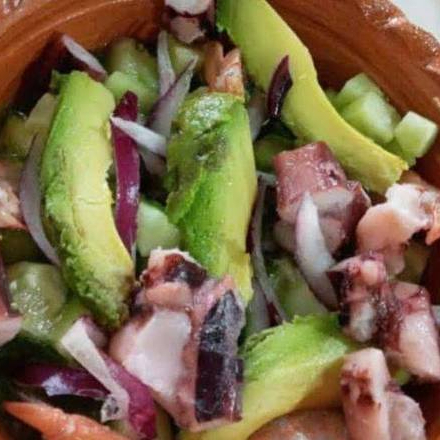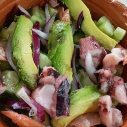 250 g Ensalada de camarón y pulpo, elaborado con mayonesa, crema y pico de gallo, aguacate y vinagreta de la casa.