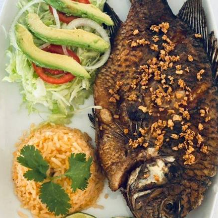 Mojarra 500 a 600 g acompañado de arroz y ensalada lechuga zanahoria y jitomate.