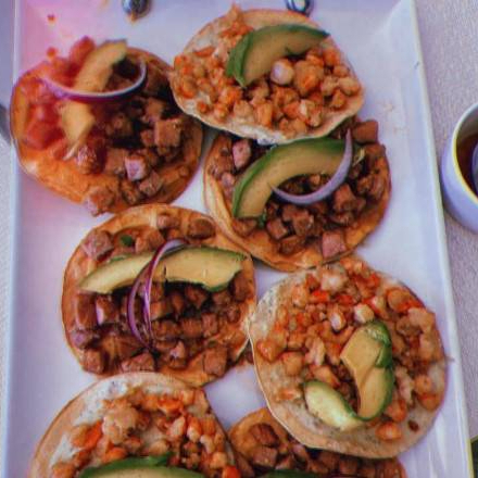 3 Tostadas crujientes con minilla, aguacate y cebolla morada.