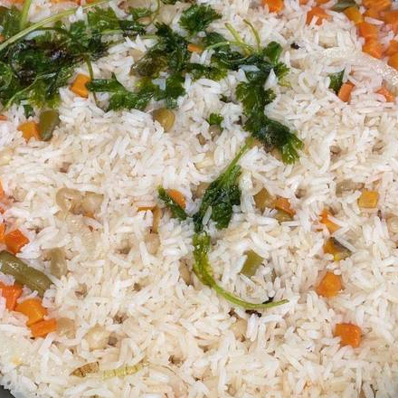 Arroz blanco con trocitos de plátano, mezclado con verduras picadas como zanahoria y ejote.