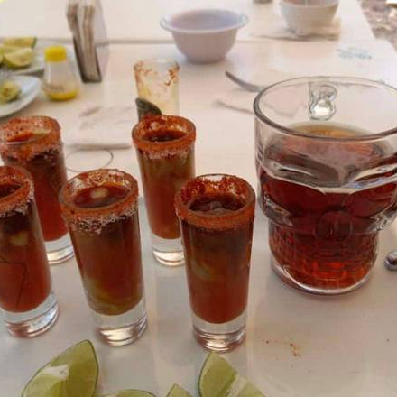 12 Shots de ostión en jugo rojo, vasos escarchados con chile.