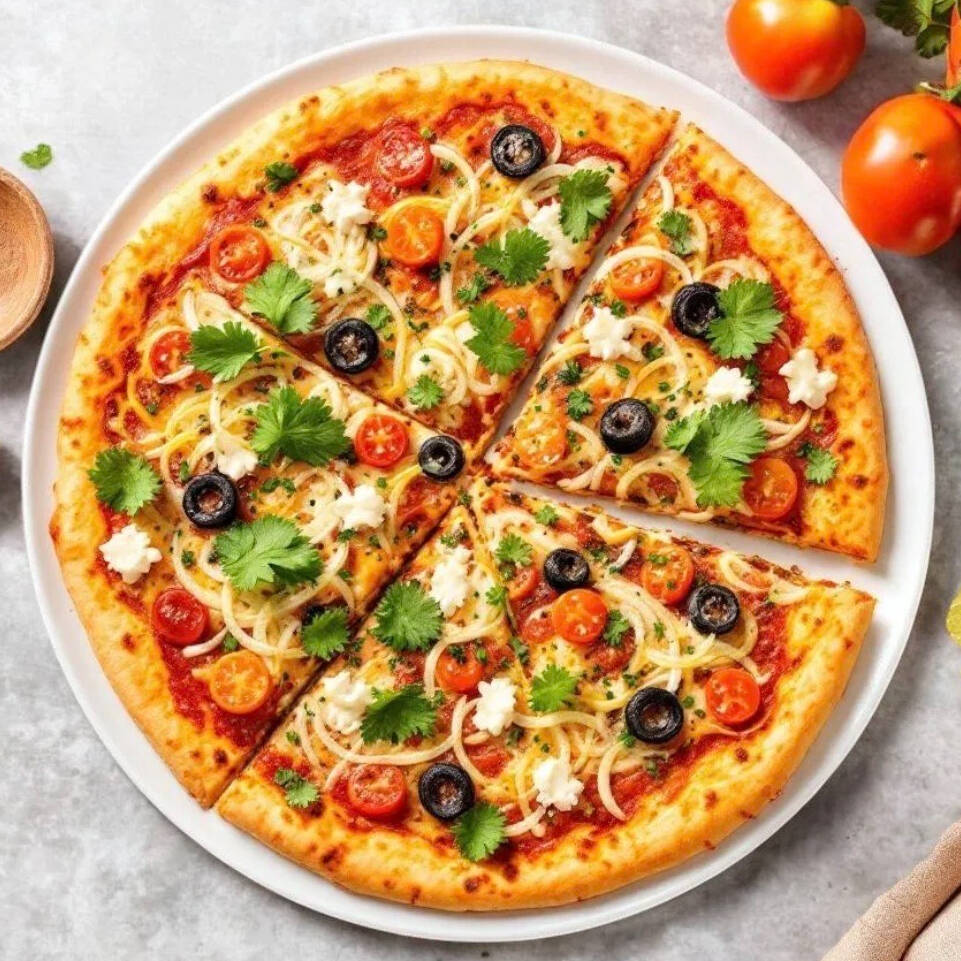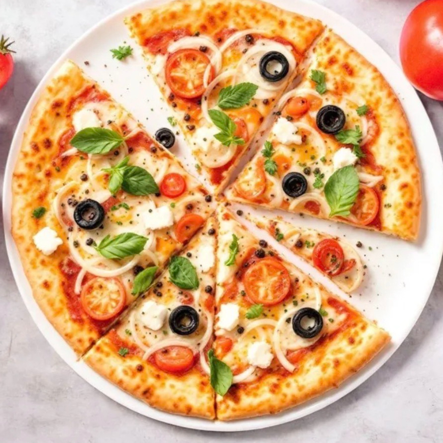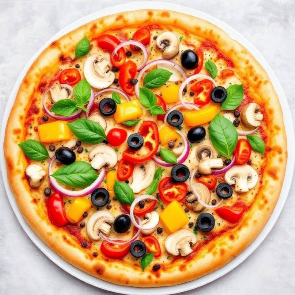 Pizza preparada con masa y salsa de la casa, mix de quesos, champiñones, pimientos, cebolla y aceitunas.