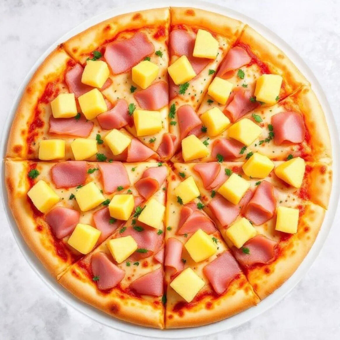 Pizza preparada con masa y salsa de la casa, mix de quesos,, combinando el sabor del jamón con la dulzura de la piña.