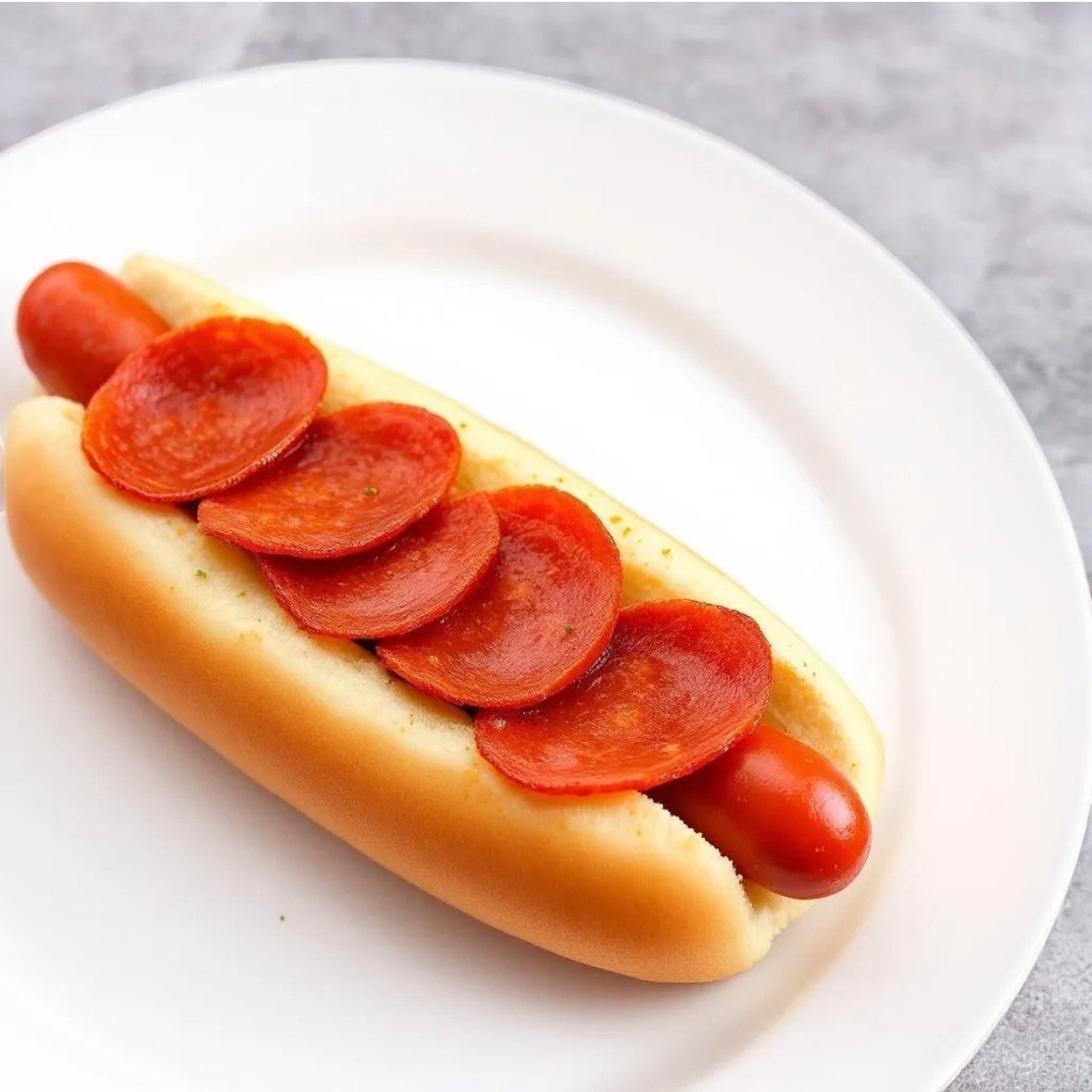 Hot dog cubierto con rodajas de pepperoni y queso.