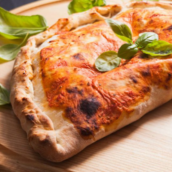 Calzone preparado con masa y salsa de la casa, mix de quesos y tomate