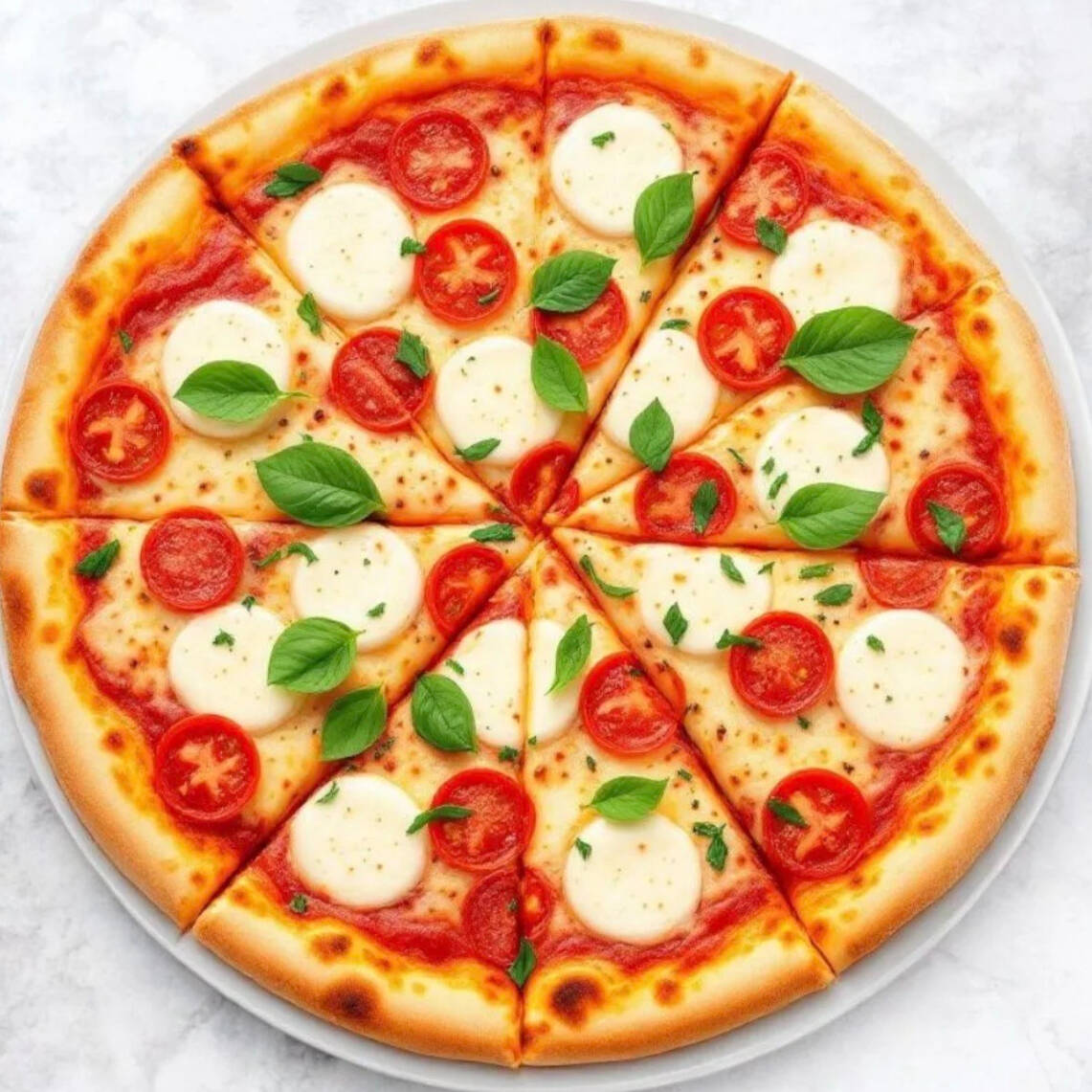 Pizza preparada con masa y salsa de la casa, mix de quesos y tomate.