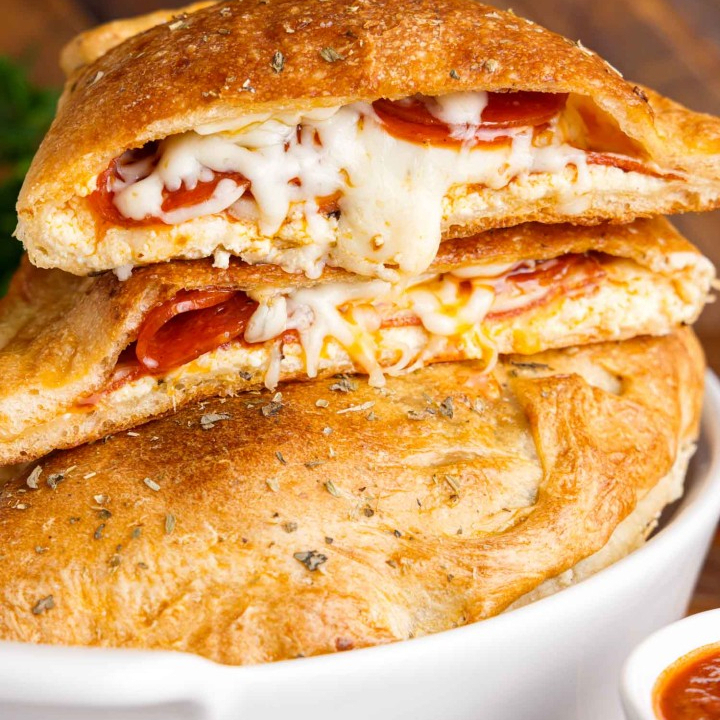Calzone preparado con masa y salsa de la casa, mix de quesos y pepperoni