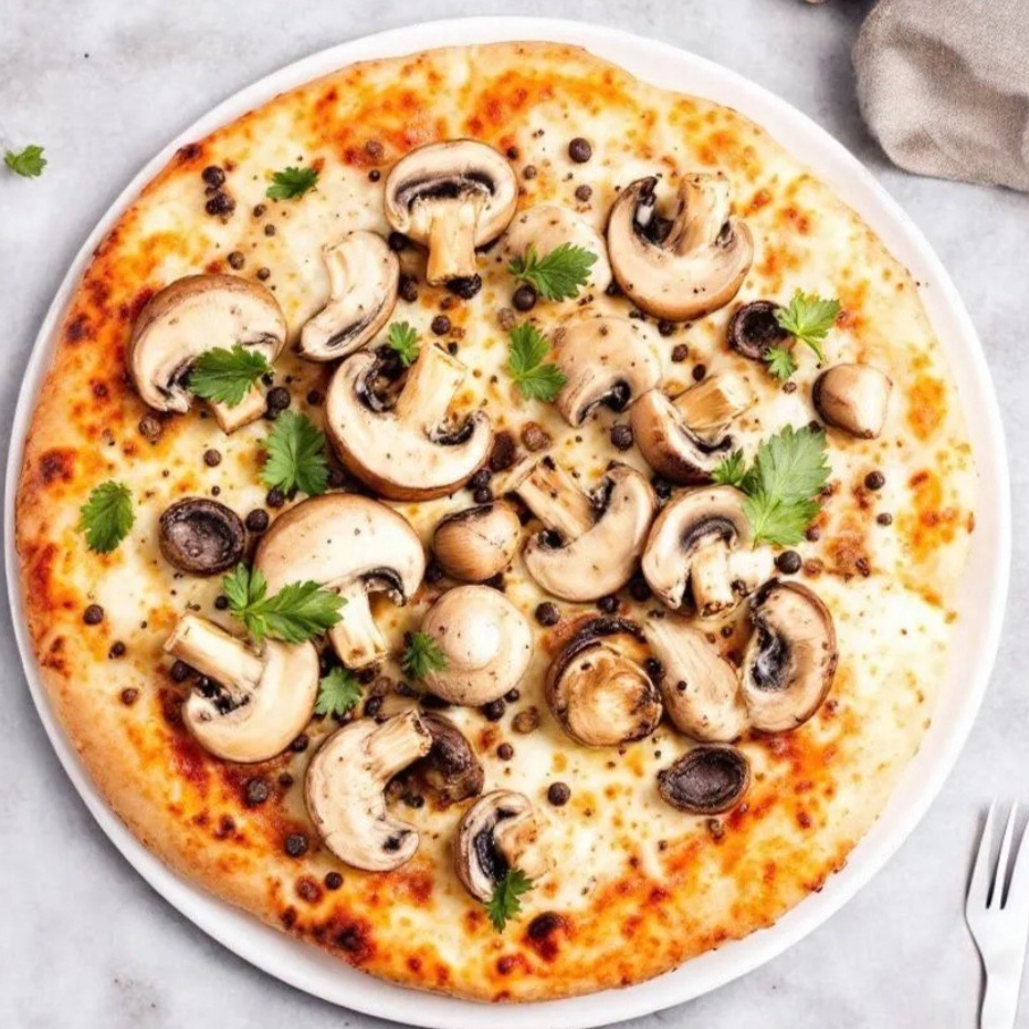 Pizza preparada con masa y salsa de la casa, mix de quesos y champiñones.