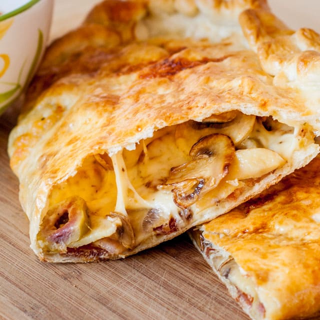 Calzone preparado con masa y salsa de la casa, mix de quesos y champiñones