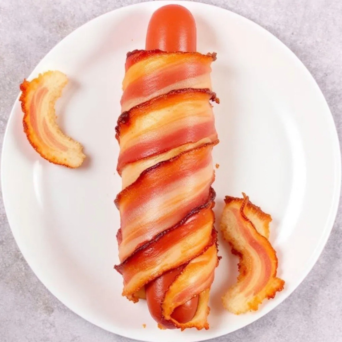 Hot dog coronado con crujiente tocino, una combinación irresistible.