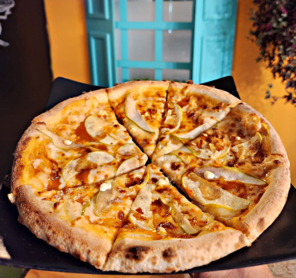 Masa artesanal con nuestra salsa especial de la casa, queso mozzarella, pera, manzana, queso de cabra y reduccion de canela.