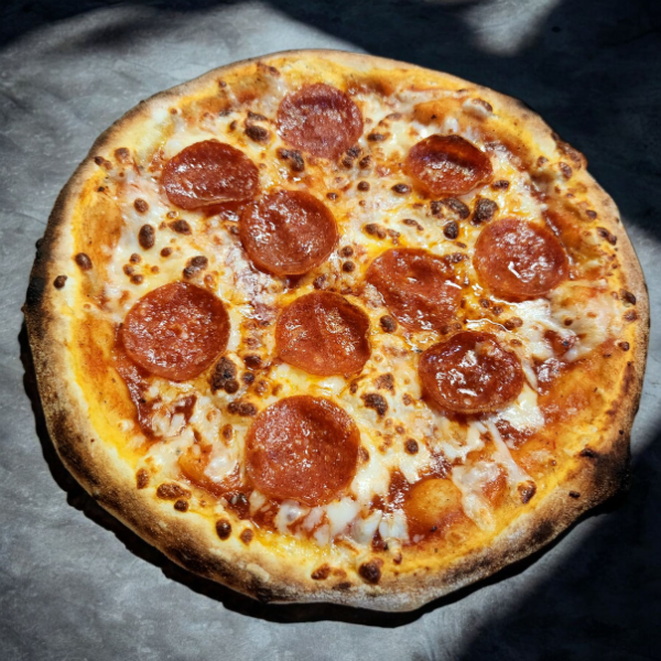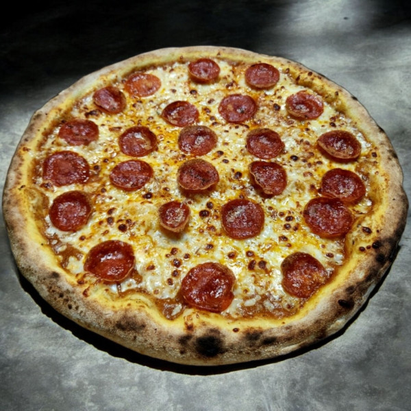 Masa artesanal, salsa de tomate de la casa, Queso mozzarella y pepperoni de primera.