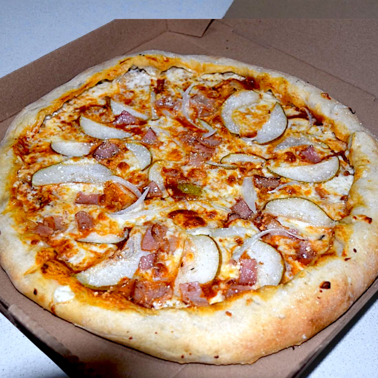 Masa artesanal con nuestra salsa especial de la casa, queso mozzarella, tocino, queso parmesano, pera, cebolla y especias.