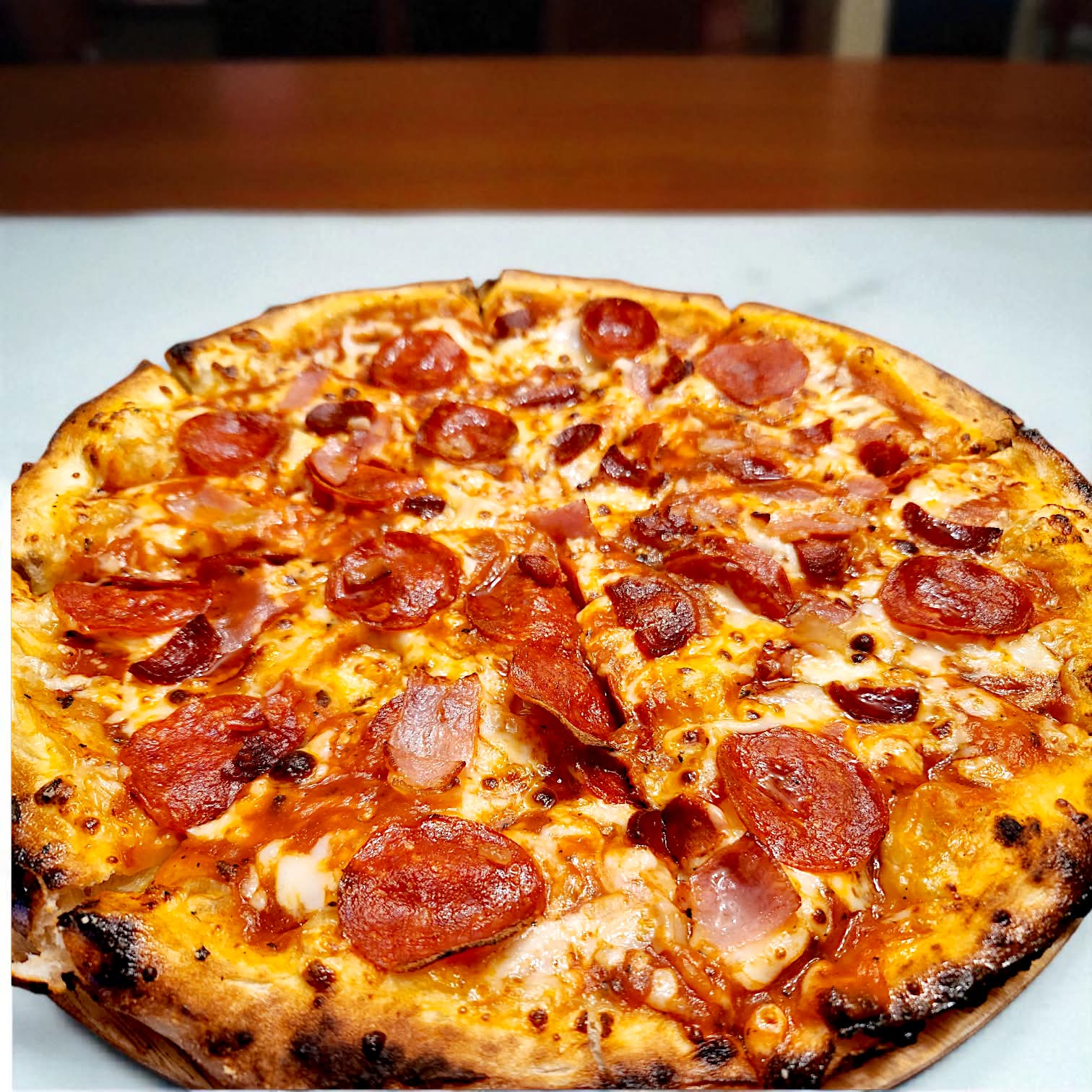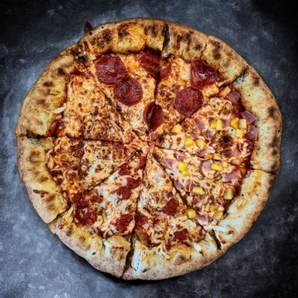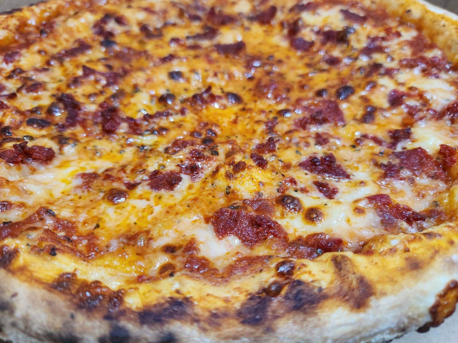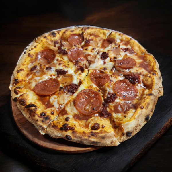 Masa artesanal, salsa de tomate de la casa, Queso mozzarella, pepperoni, chorizo y tocino.