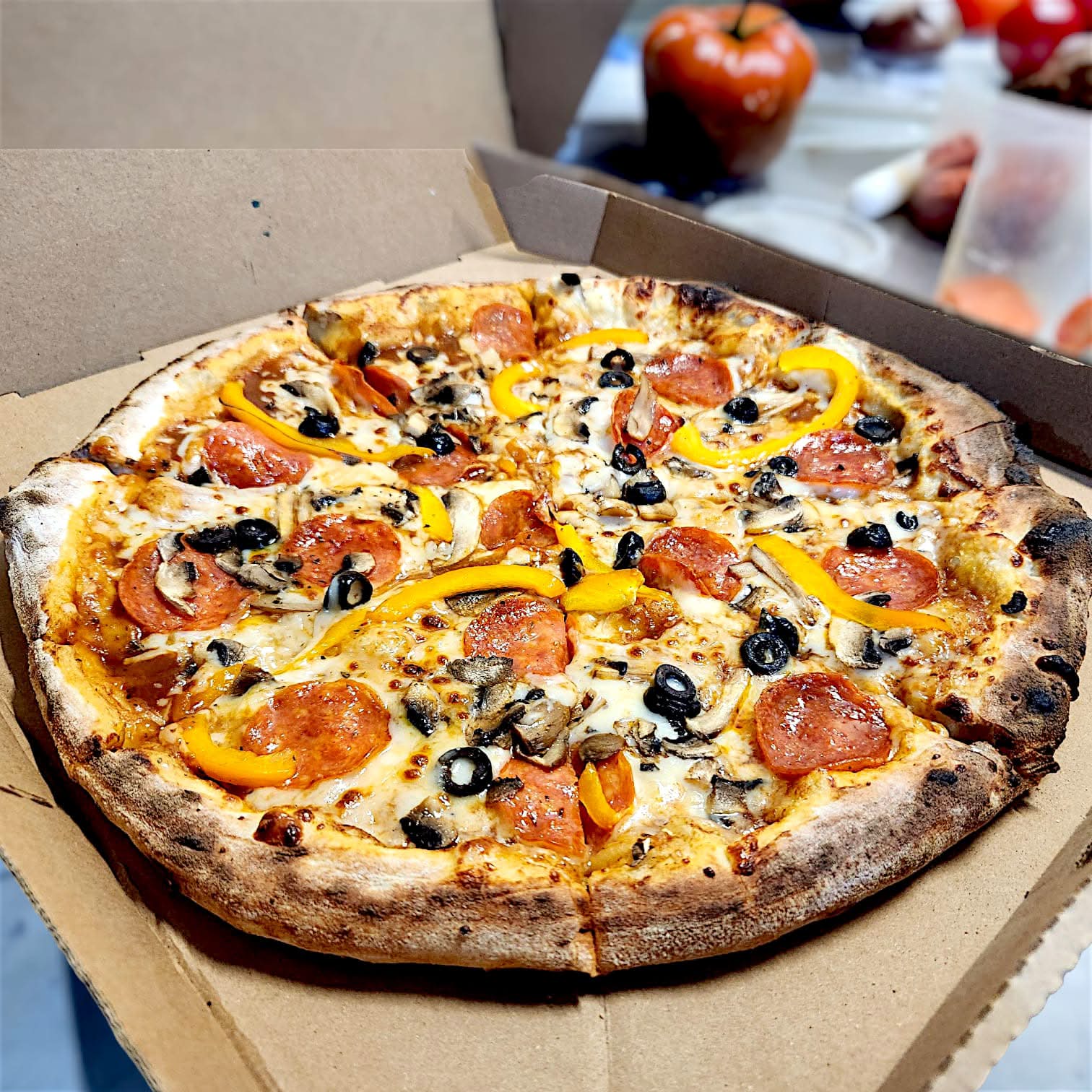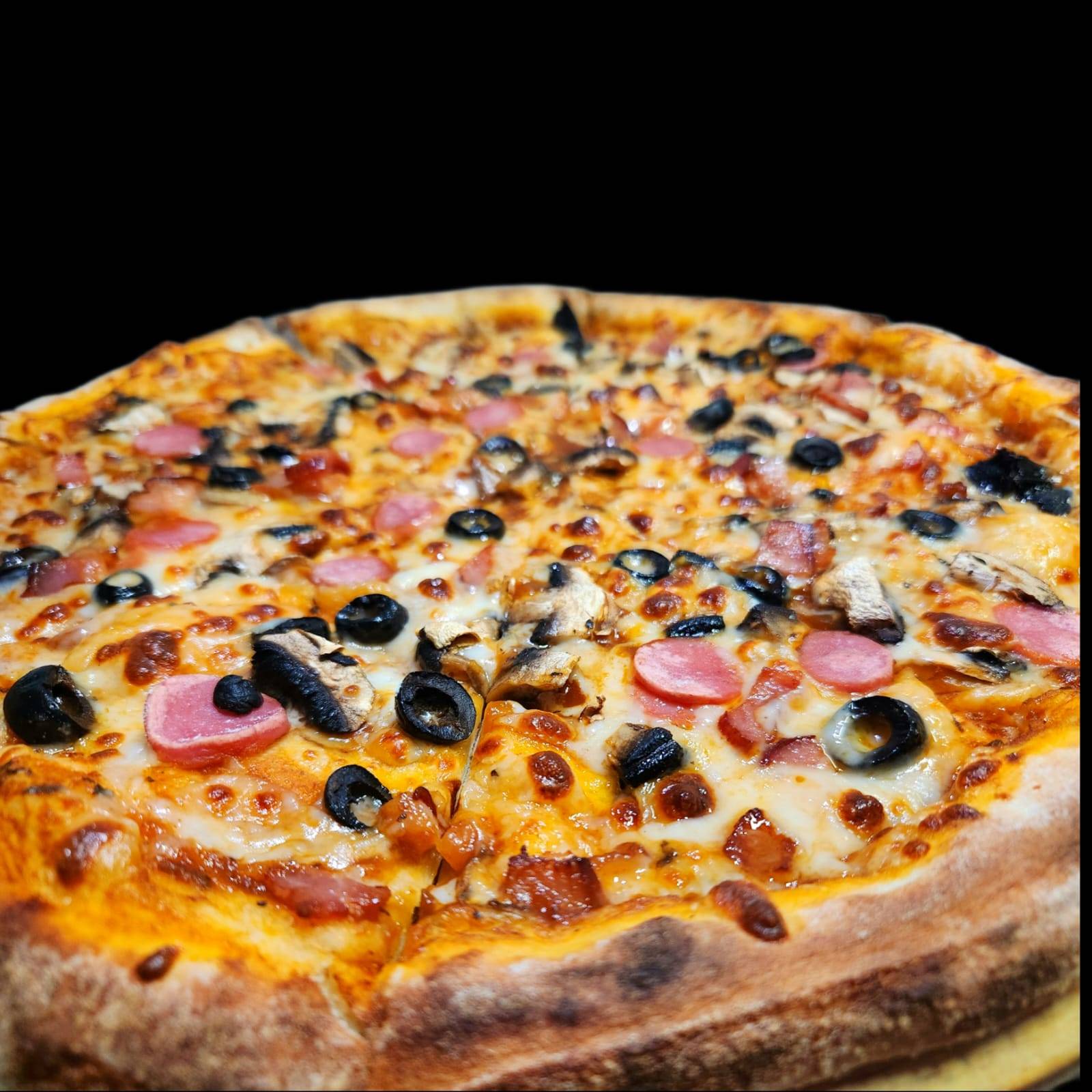 Masa artesanal con nuestra salsa especial de la casa, queso mozzarella, pepperoni, aceitunas negras, pimiento y champiñones.