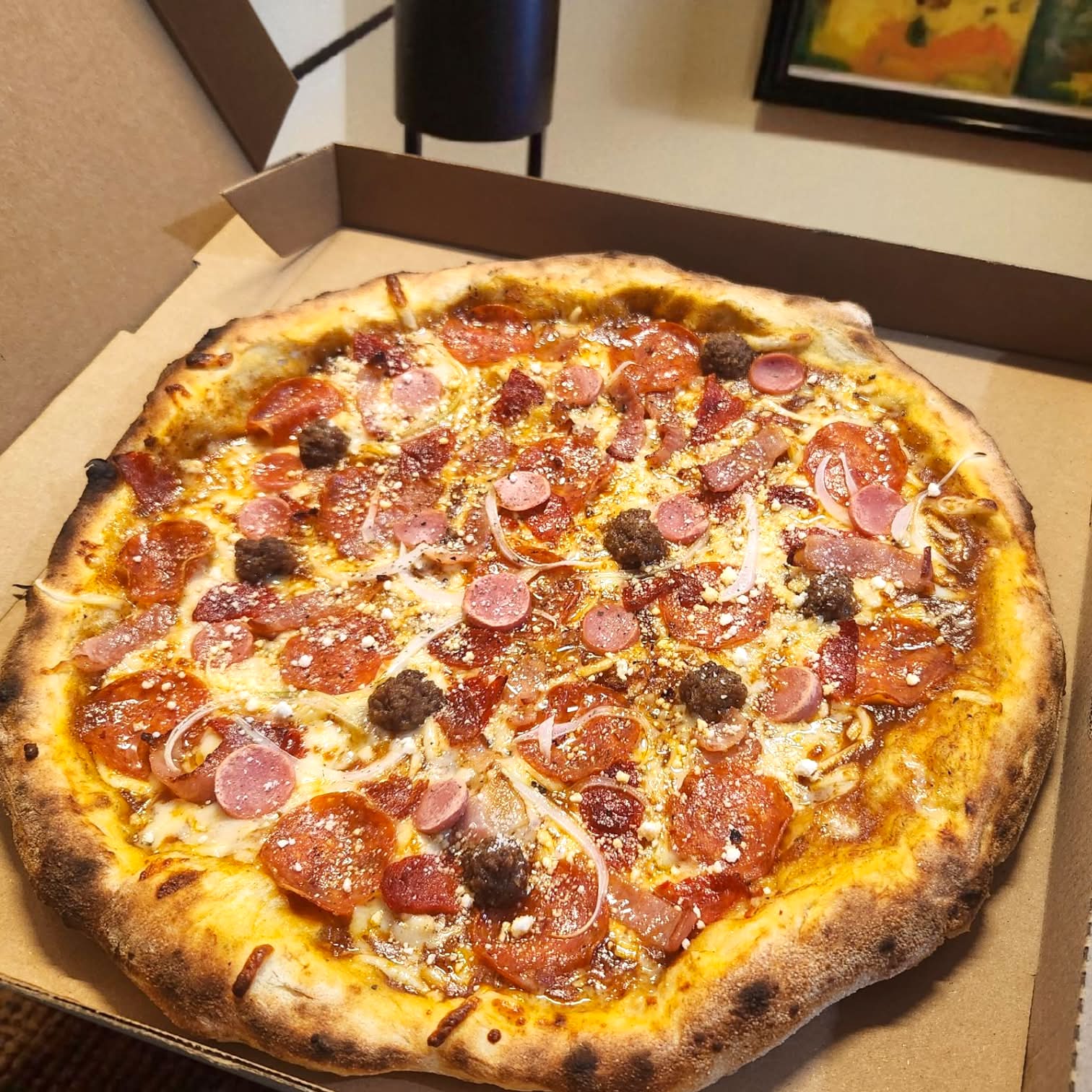 Masa artesanal con nuestra salsa especial de la casa, queso mozzarella, salchicha, pepperoni, tocino, chorizo, salchicha italiana, especias italianas, cebolla y parmesano.