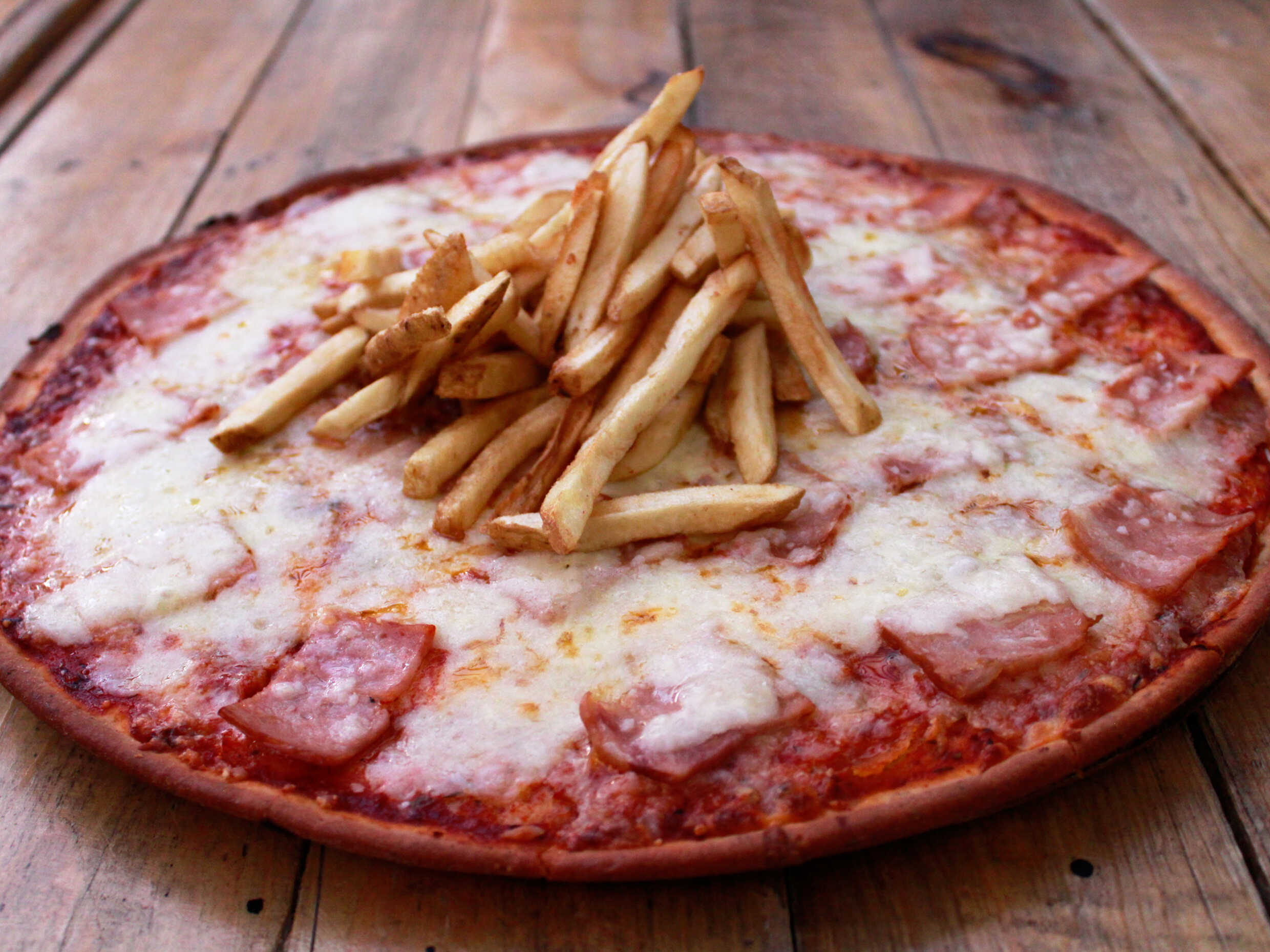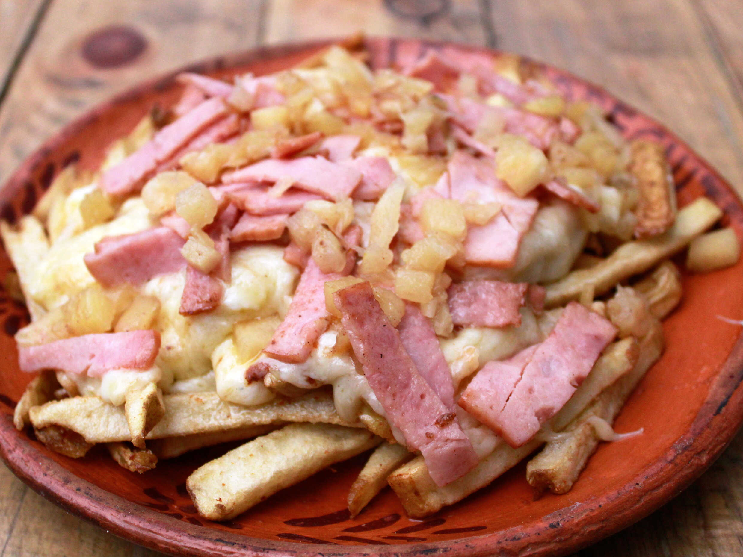 Papas a la francesa, mix de quesos, tocino, piña.